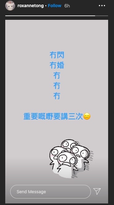 Perhaps the rumors got a bit out of hand as it made headlines all over the Chinese speaking regions. Roxanne Tong responded to the marriage rumors through IG story on September 8. She wrote, “No flash wedding, no marriage, no, no, no. Important things must be said three times.”