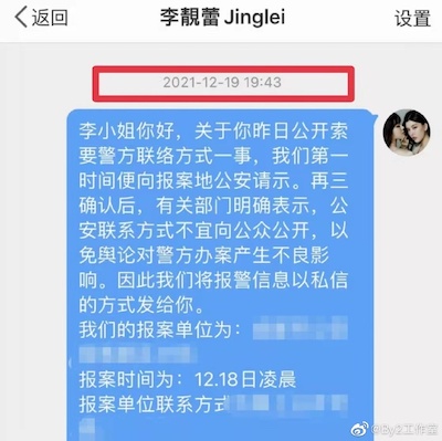 BY2 studio also revealed a private message they sent to Lee Jinglei through Weibo with the police’s contact information on December 19, 2021. They explained after discussing it with the municipal police bureau, they don’t want to publicly reveal their contact information to avoid having negative impact on their investigation. BY2 privately provided the police contact information along with the case number.